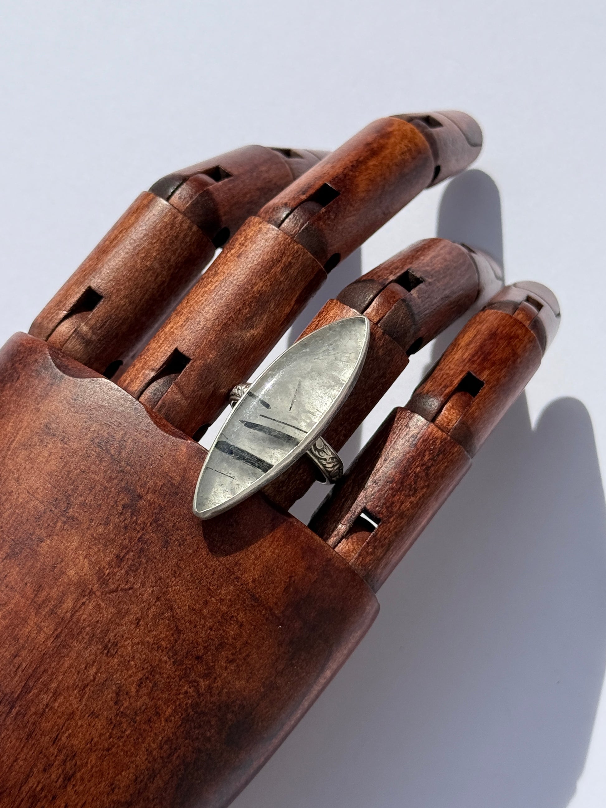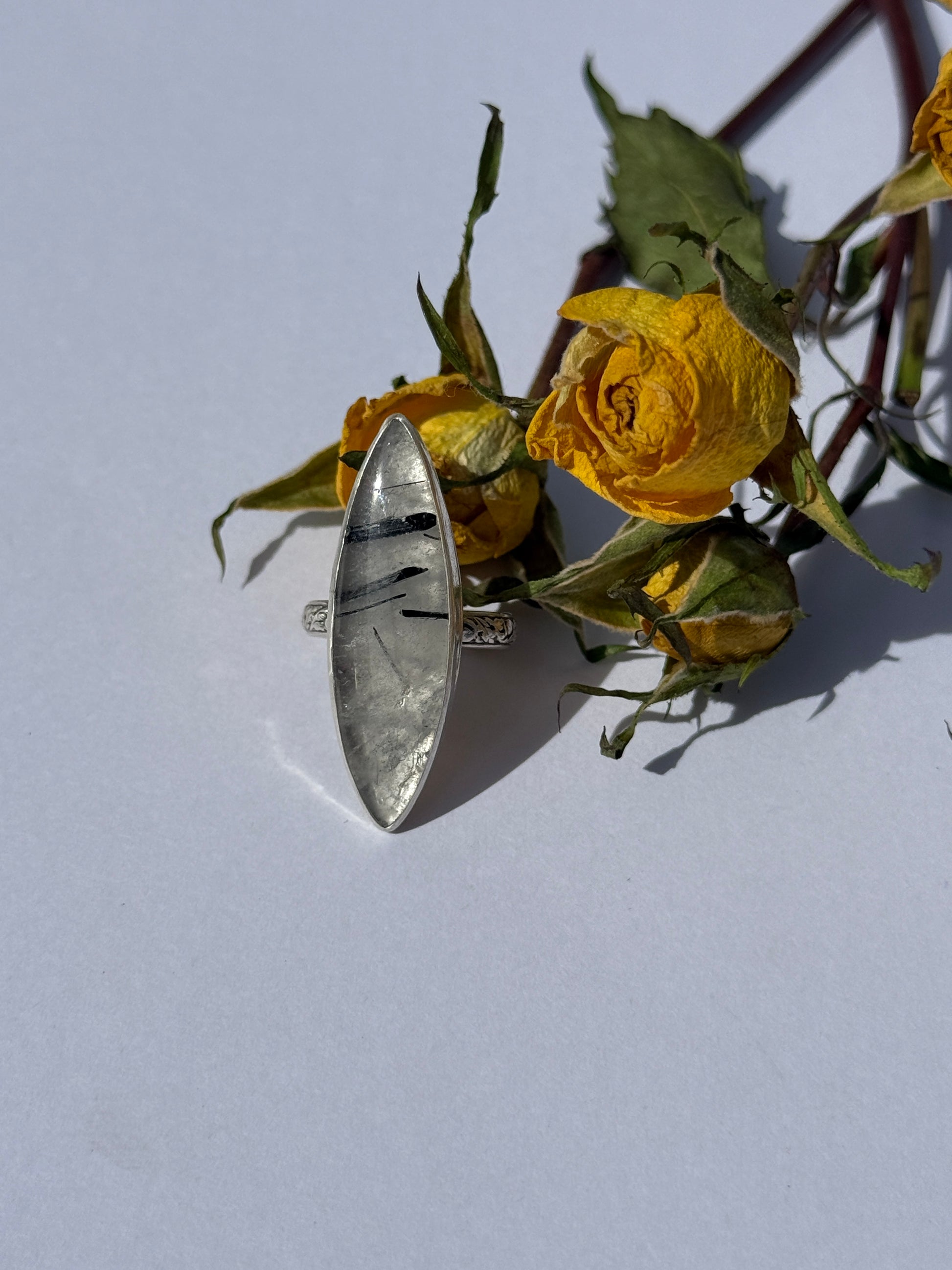 Rooted in the quiet strength of the earth and touched by light, the Earthbound Glow Ring embodies harmony, resilience, and grounded beauty. A striking black tourmaline in quartz shimmers at its center — dark veins flowing through clear stone like roots reaching for the surface. The hand-textured sterling silver band mirrors this natural rhythm, with organic details that reflect both steadiness and flow.