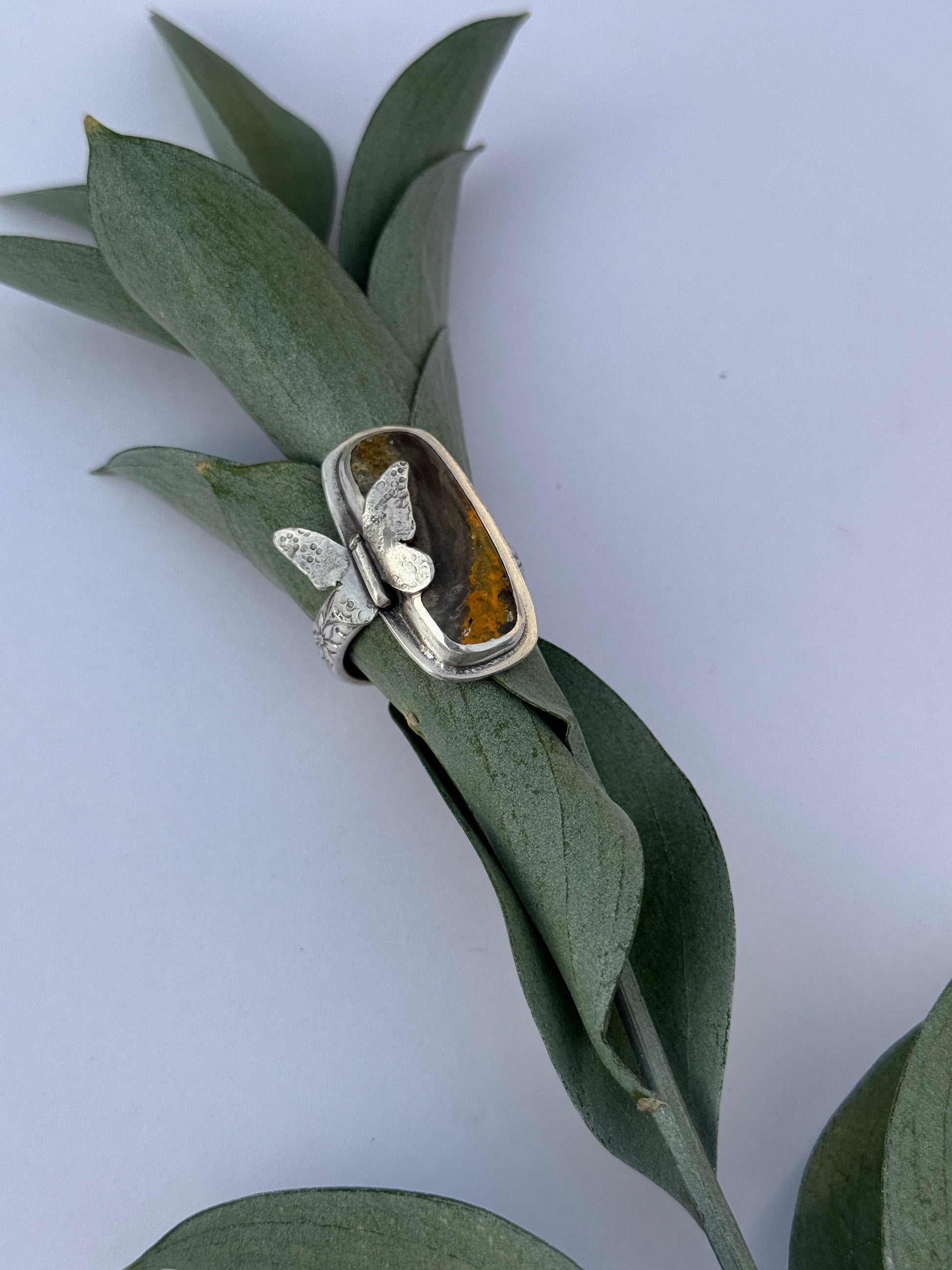 The Sunlit Wings Ring is a joyful celebration of color and transformation. Featuring a striking rectangle of bumblebee jasper from Bali, its golden yellows and smoky grays echo the warmth of sunlight breaking through clouds. Along its side rests a sterling silver butterfly, a gentle reminder of change, resilience, and the lightness of being. Together, they create a piece that feels both grounding and uplifting — a wearable moment of hope and renewal.