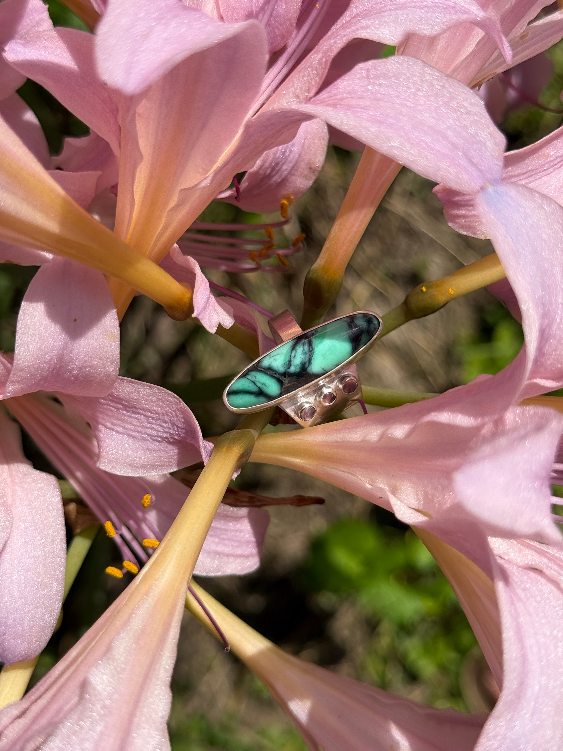 The Blushing Oasis Ring transports you to a serene desert hideaway, where gentle colors and quiet energy invite reflection and self-care. Featuring a long oval of Desert Oasis Variscite from Iran, this piece is accented with three delicate pink tourmaline stones, adding a soft, joyful glow. Handcrafted in sterling silver, the ring’s flowing design mirrors the natural curves of desert landscapes and sparkling water reflections. Wear it as a daily reminder to nurture yourself, embrace simplicity, and savor moments of calm beauty.