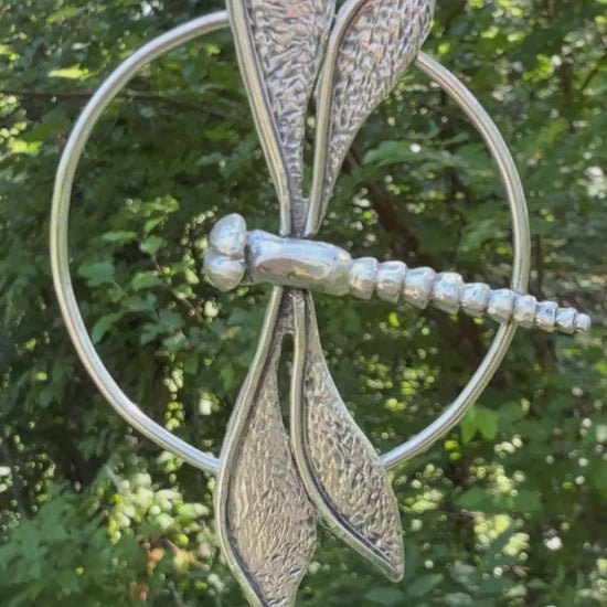• Features a detailed dragonfly resting on a circular hoop pendant