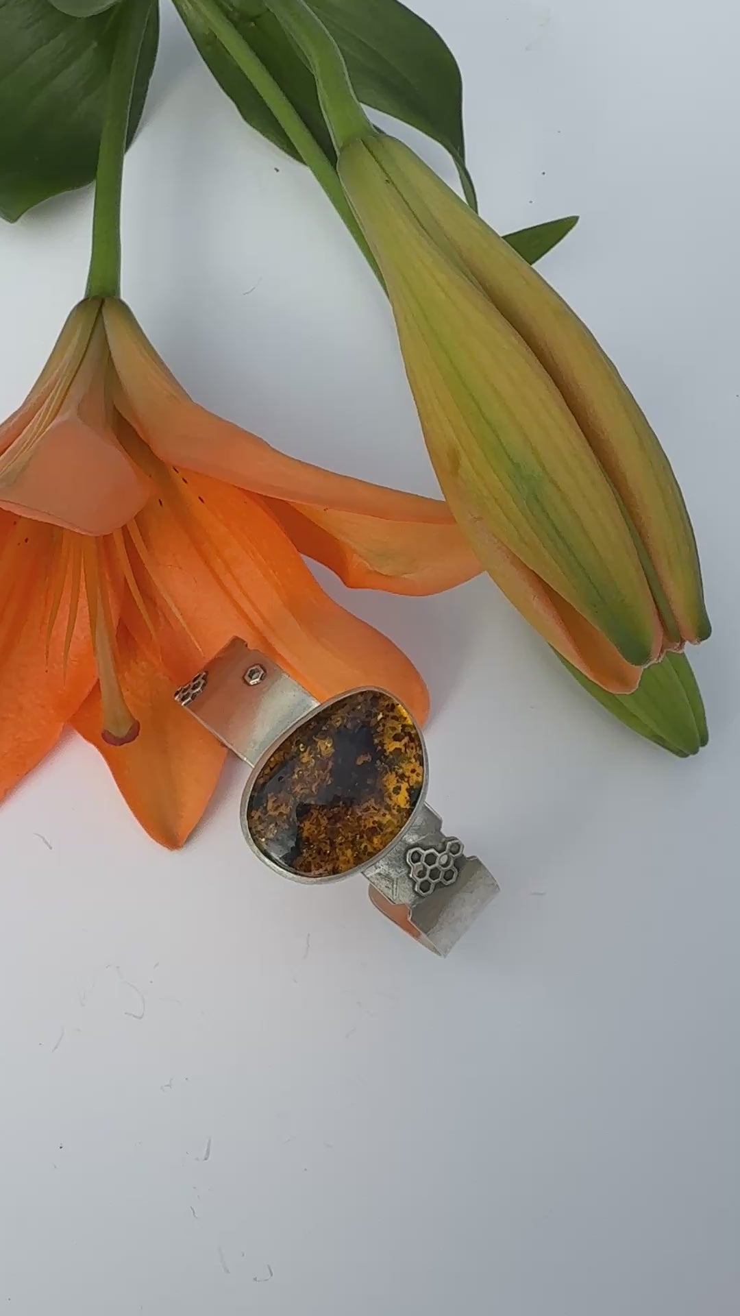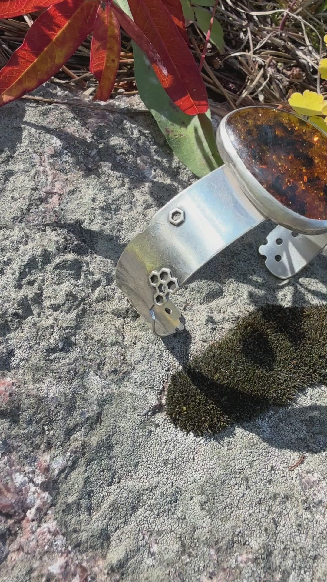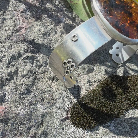 Like honey catching the morning light, the Sunlit Hive Cuff glows with warmth and quiet strength. A luminous Baltic amber rests at its center, rich with the golden hues of ancient forests and the gentle energy of the sun. The hand-textured honeycomb pattern on sterling silver reflects both nature’s geometry and its wild, organic beauty.