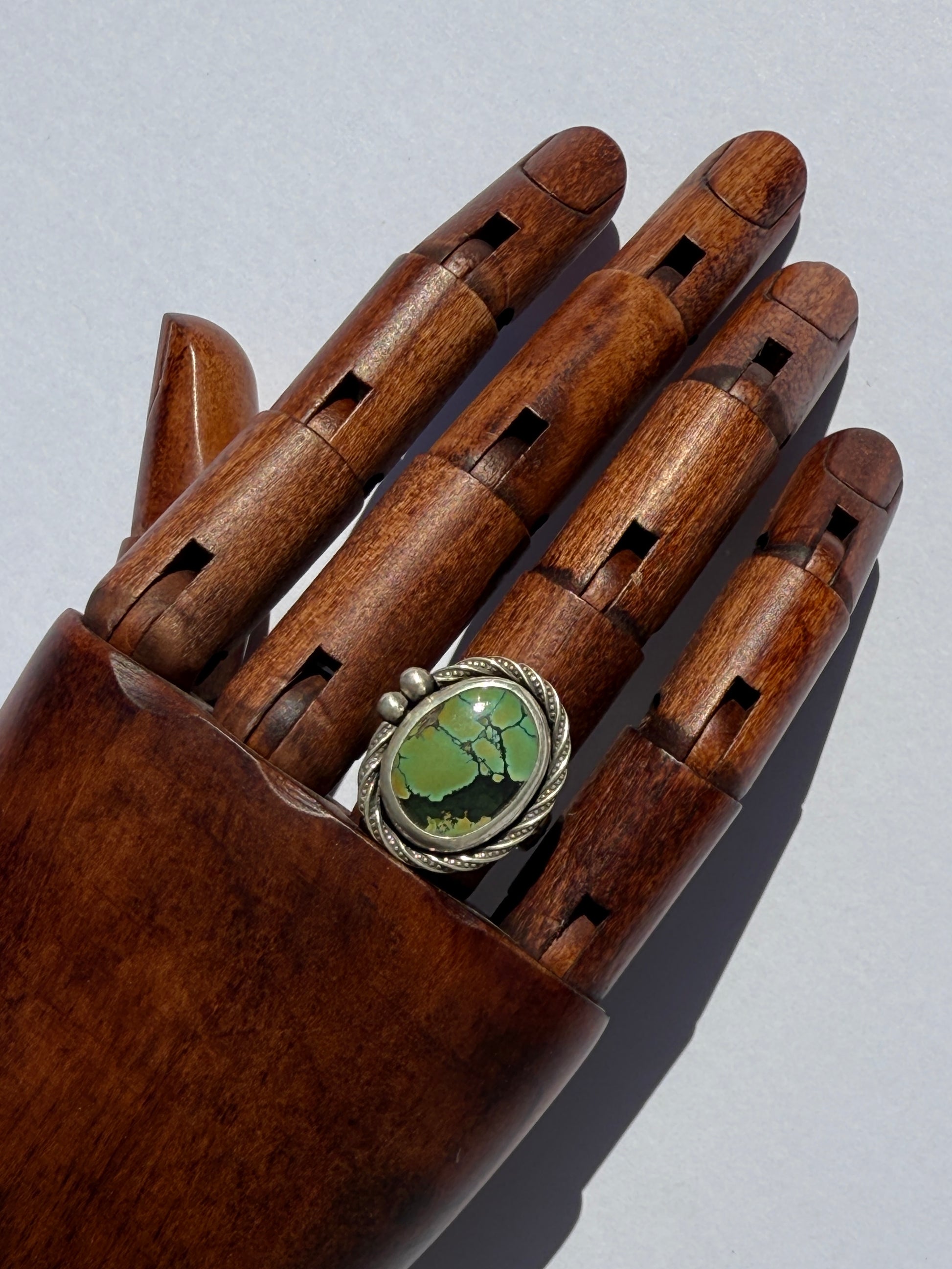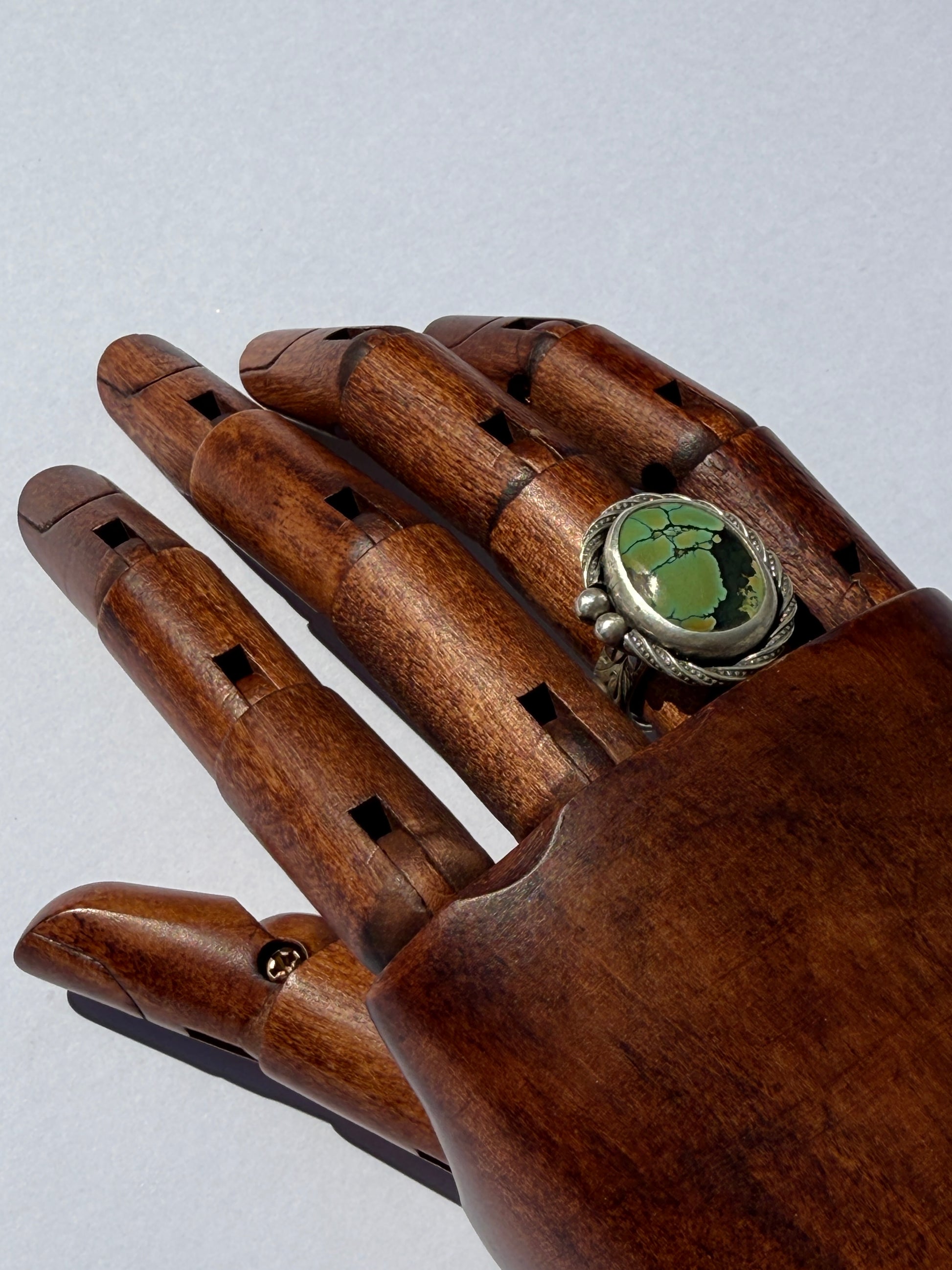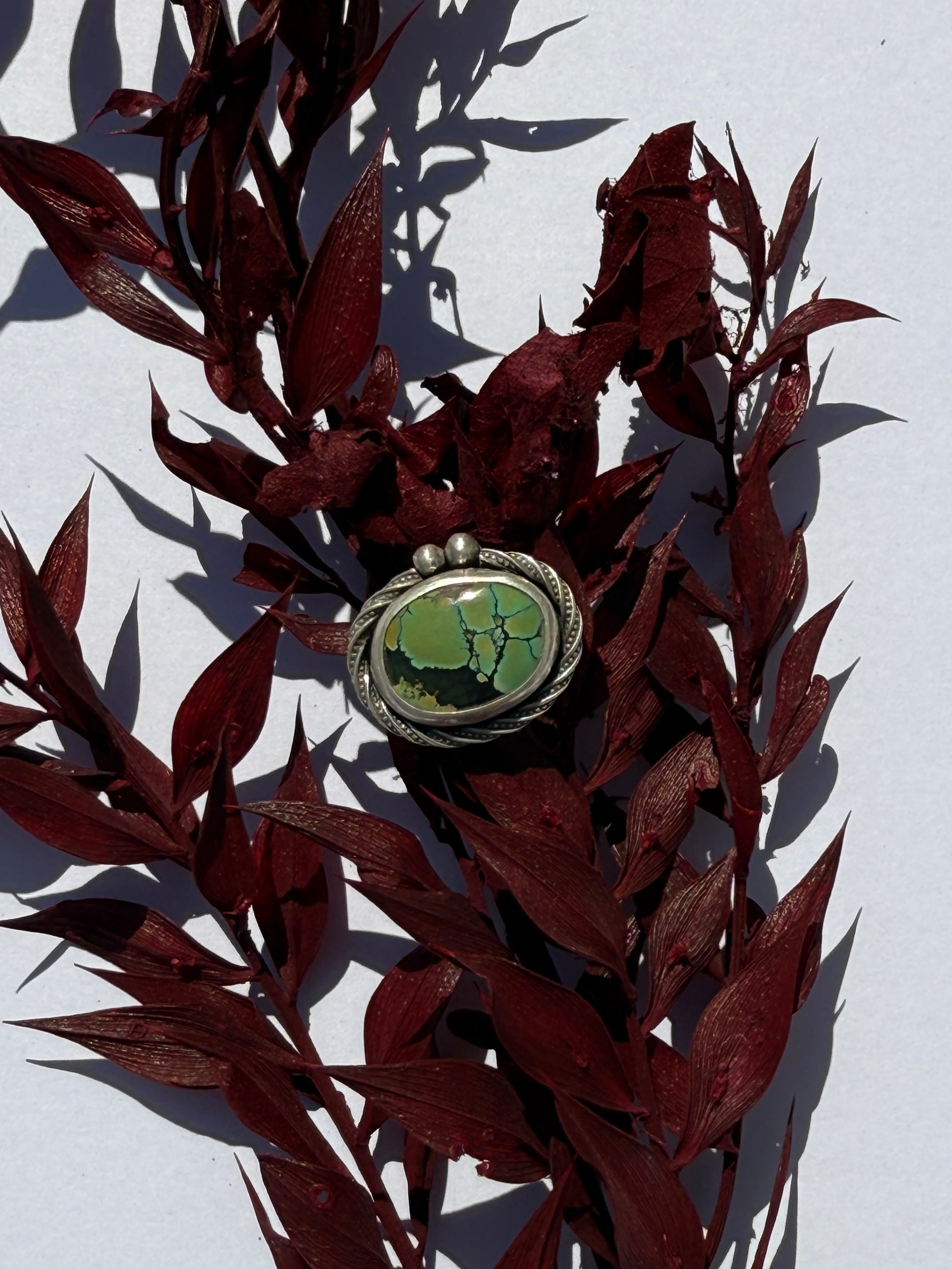 The Tranquil Waters Ring captures the soothing flow of nature’s gentle rhythms. Featuring a luminous oval of Hubei turquoise from China, its surface shimmers with shifting hues of blue and green, like sunlight rippling across a quiet stream. Encircled by a hand-twisted silver frame, the stone feels both grounded and alive — a reminder of balance, calm, and the beauty of slowing down.