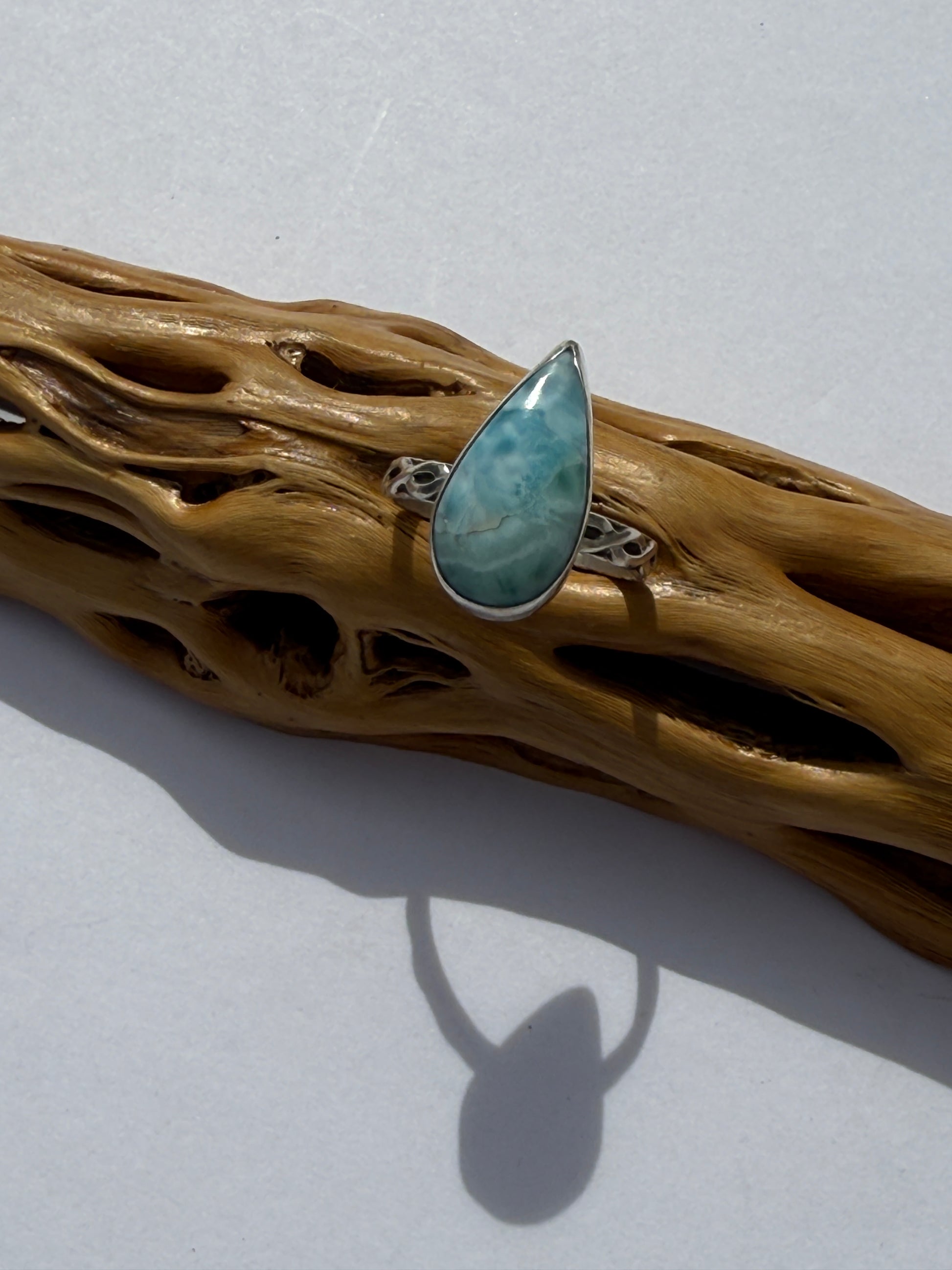 Like the first light glimmering across the sea, the Teardrop Morning Tide Ring carries the tranquil rhythm of water and sky. A smooth Larimar teardrop rests at its center, glowing with shifting shades of pale blue and white that echo soft waves beneath the morning sun. The sterling silver band, hand-textured with organic detail, mirrors the gentle movement of rippling water — fluid, luminous, and full of quiet grace.