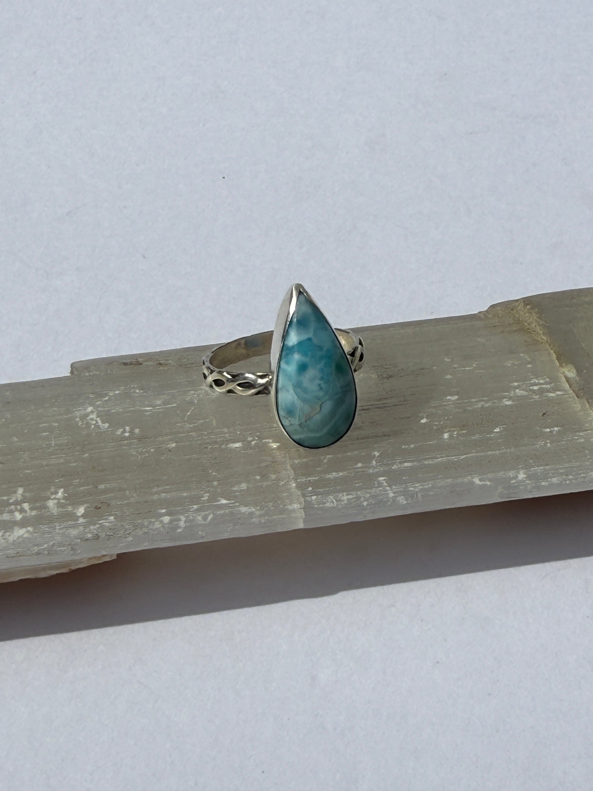 Teardrop Morning Tide Ring: Sterling Silver & Larimar Teardrop - size 8.5