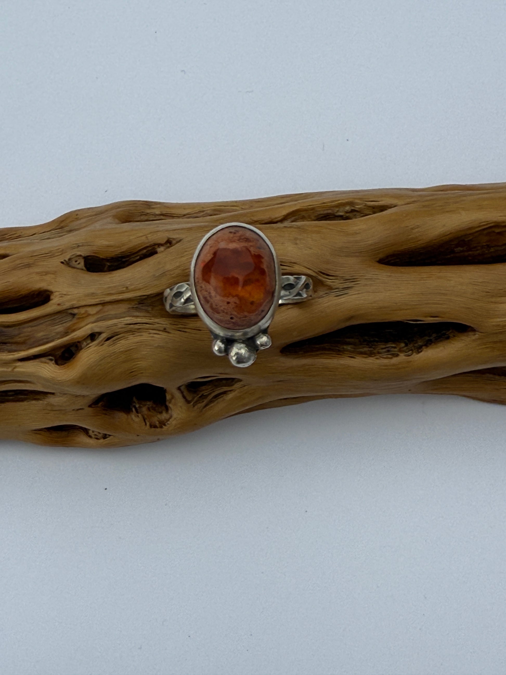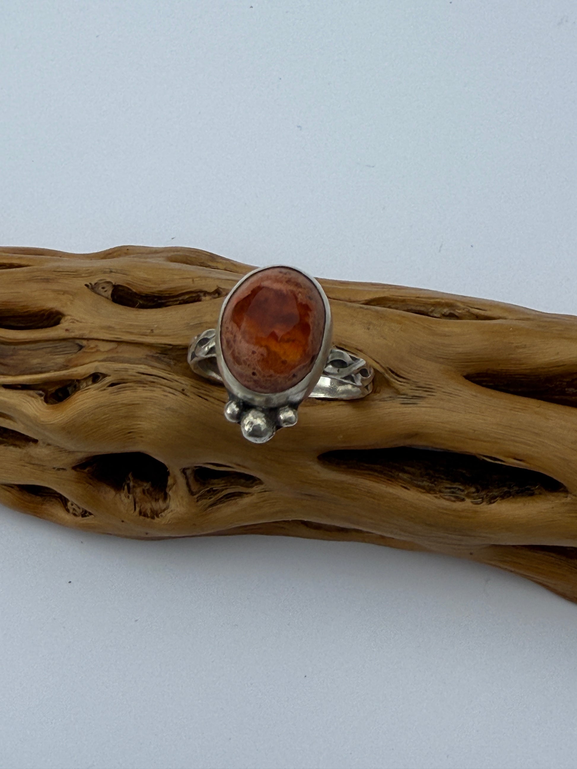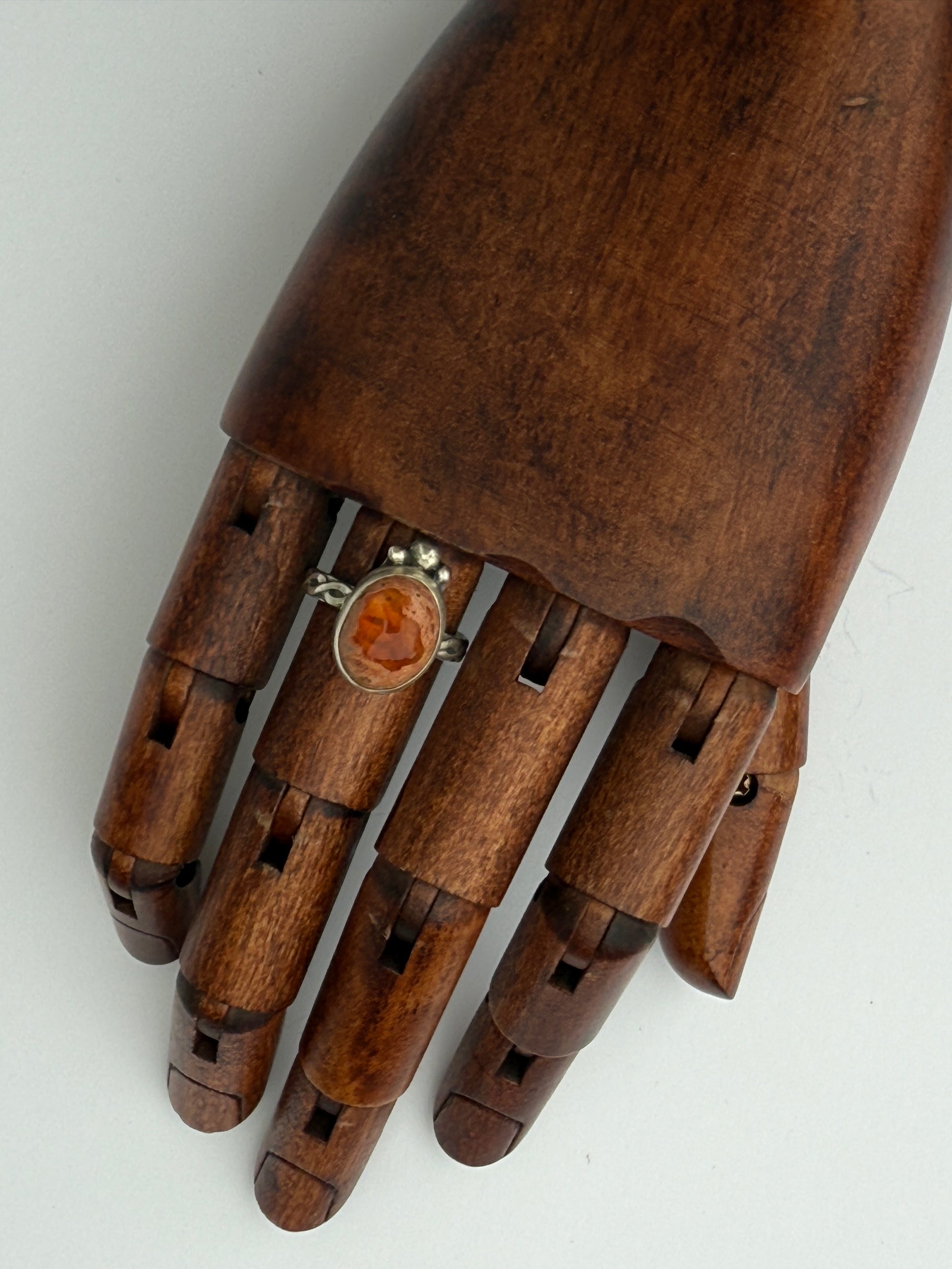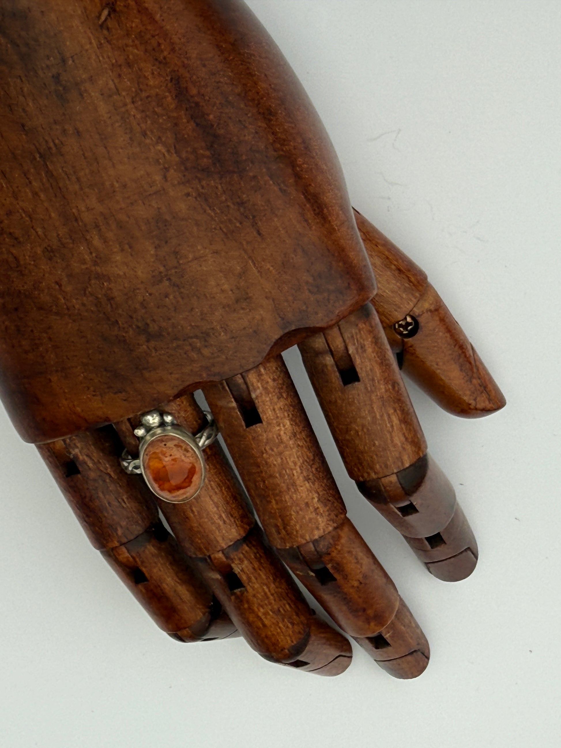 The Flameheart Ring captures the fiery pulse of the earth — a symbol of transformation, passion, and resilience. Featuring a mesmerizing Mexican Dragon Fire Opal, this piece radiates warm flashes of orange and gold, like sunlight dancing across embers at dusk. Handcrafted in sterling silver, the design balances organic texture with bold elegance, grounding the opal’s vivid fire in strength and simplicity.