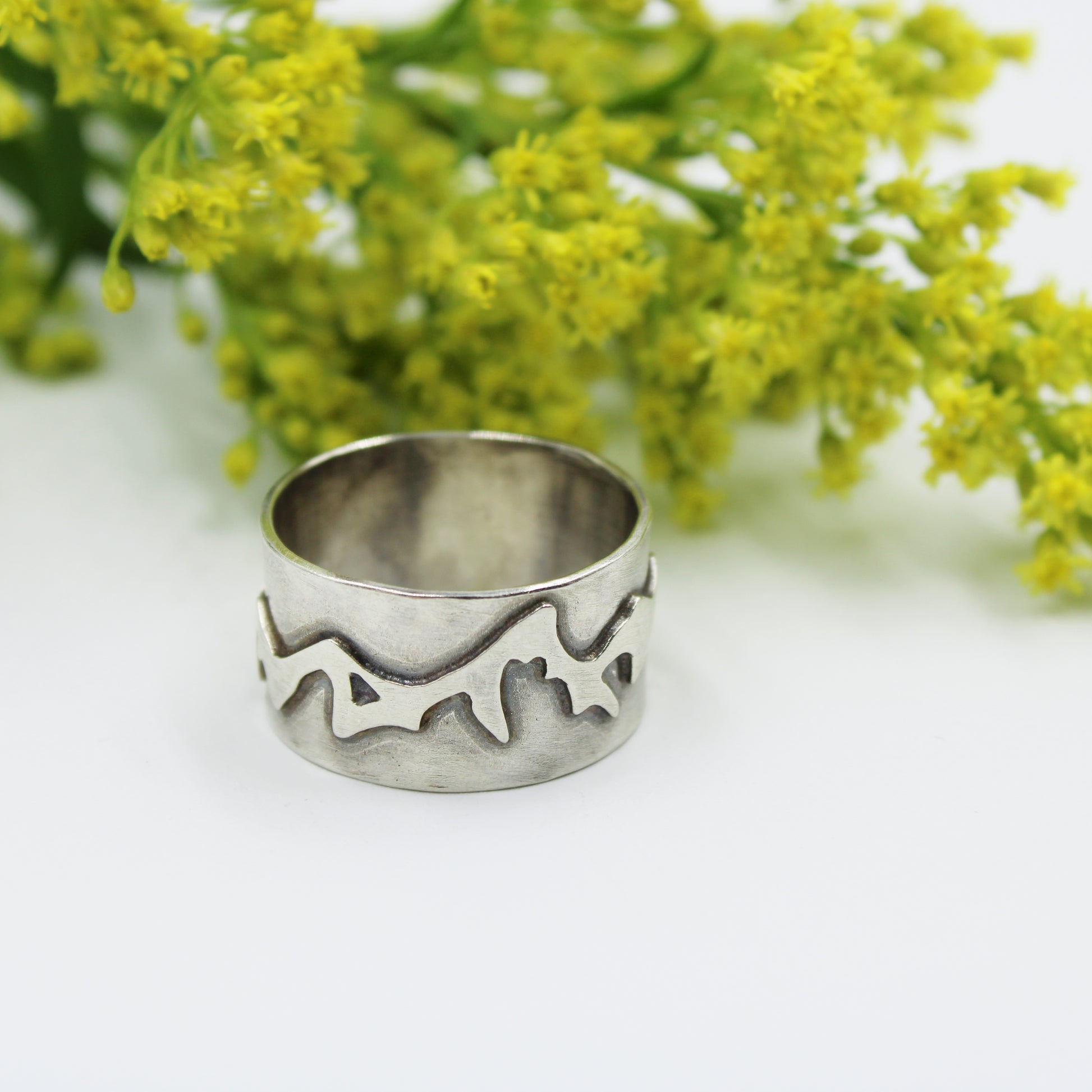 • Design: Hand-cut mountain landscapes on a wide band; each ring is ~0.5" wide and weighs ~8g
