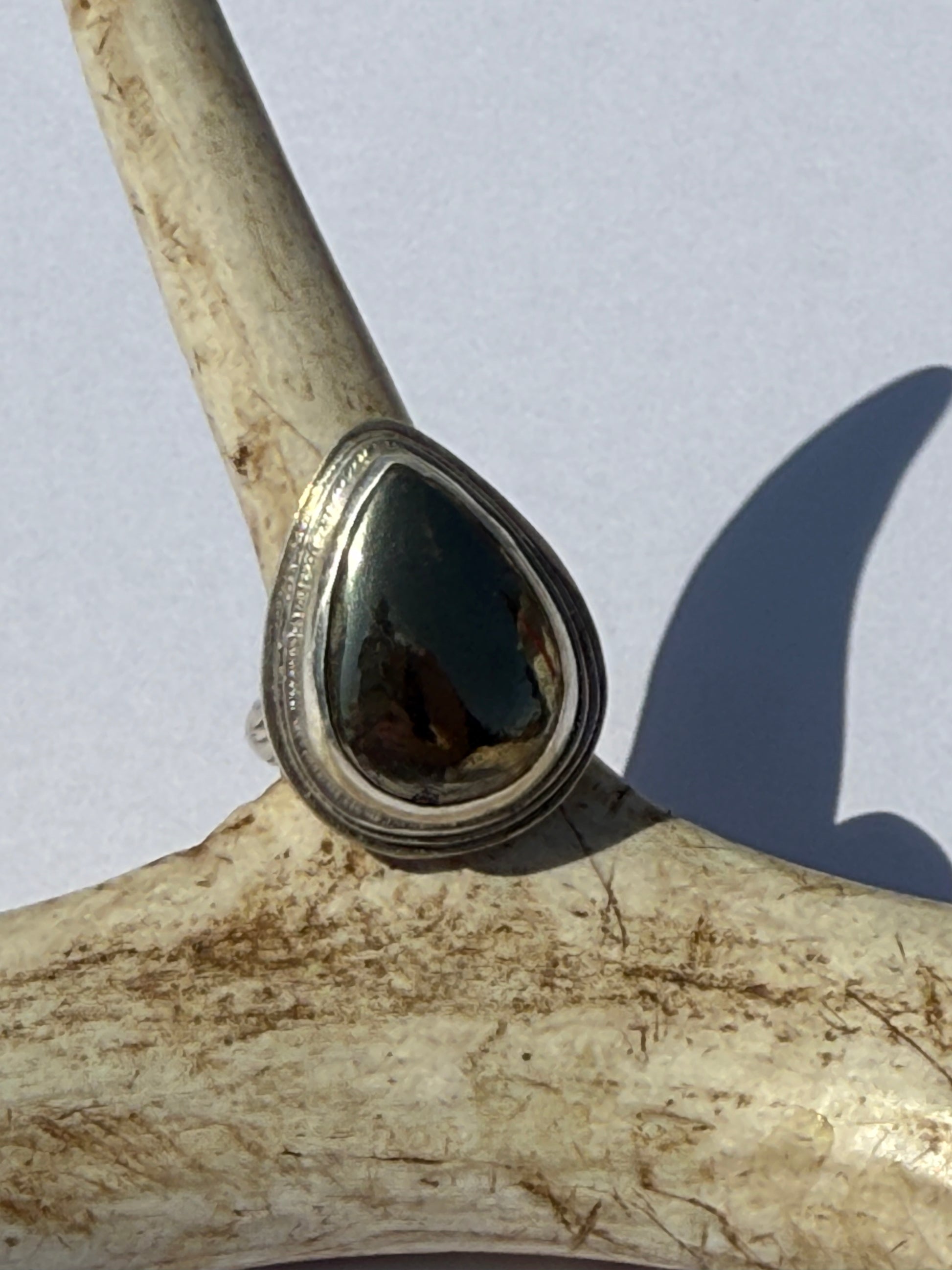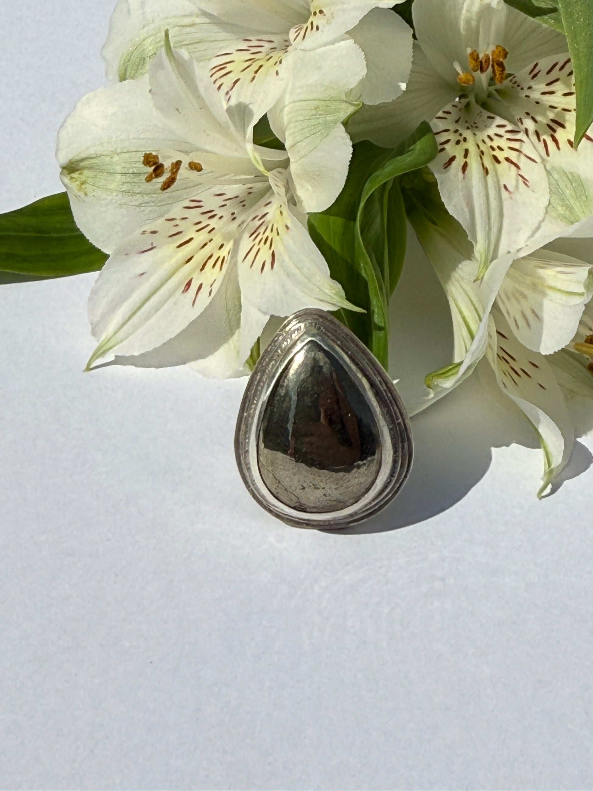 The Ripple Ring captures the quiet beauty of movement and reflection. A teardrop of golden pyrite rests at its center, framed by concentric teardrops of sterling silver that echo the ripples spreading across still water. Each shimmer of pyrite feels like sunlight catching on a lake’s surface, grounding yet luminous. This ring is a reminder that even the smallest moments of stillness can create waves of strength, calm, and connection within you.