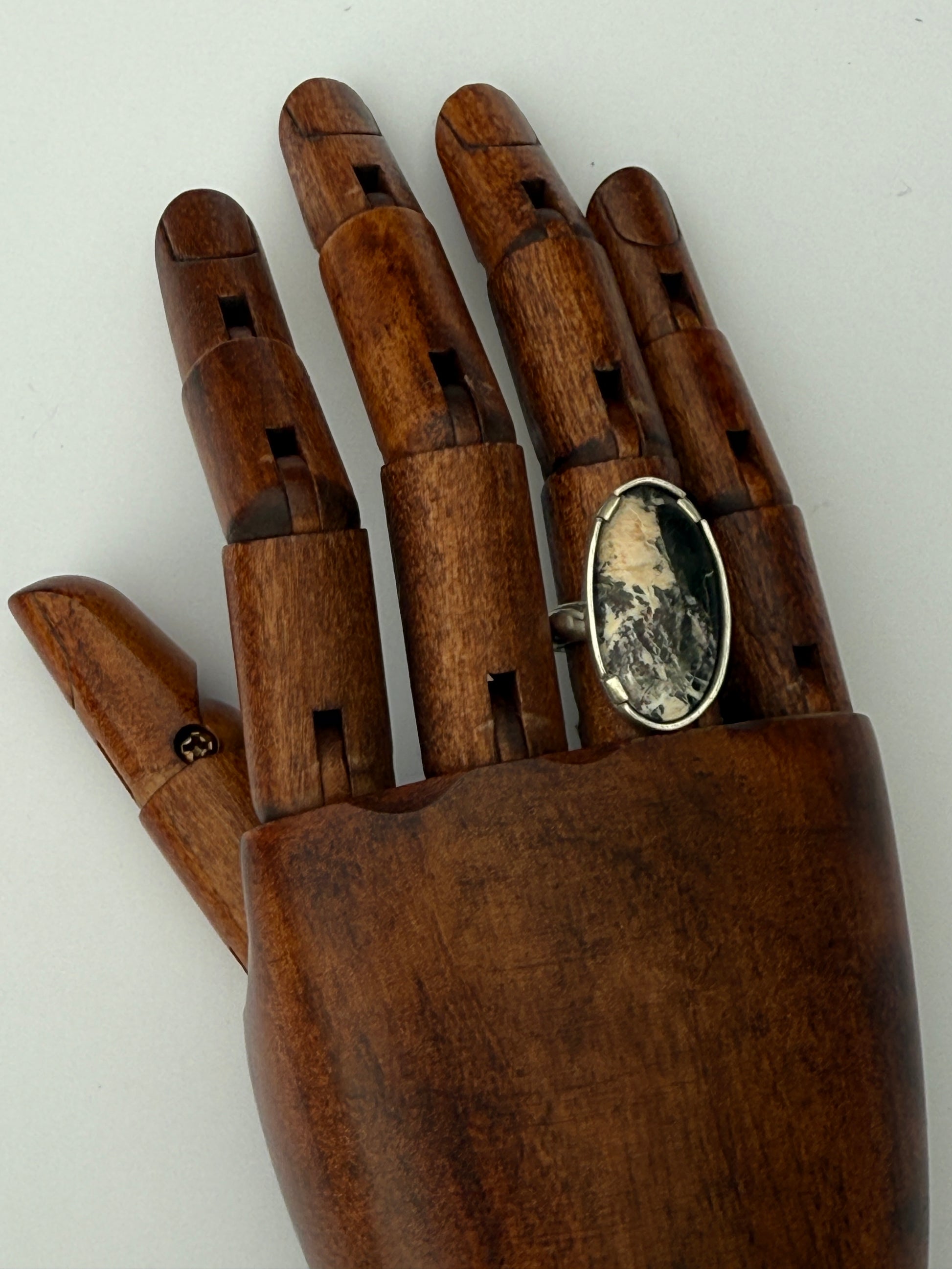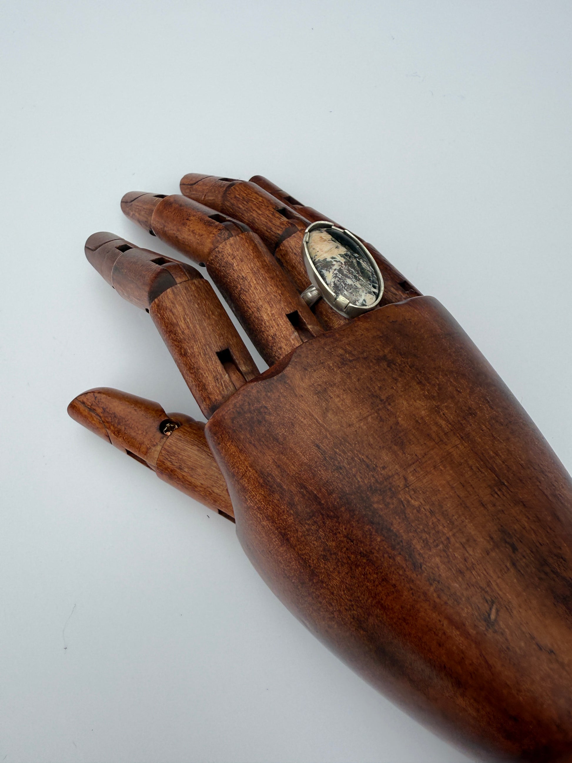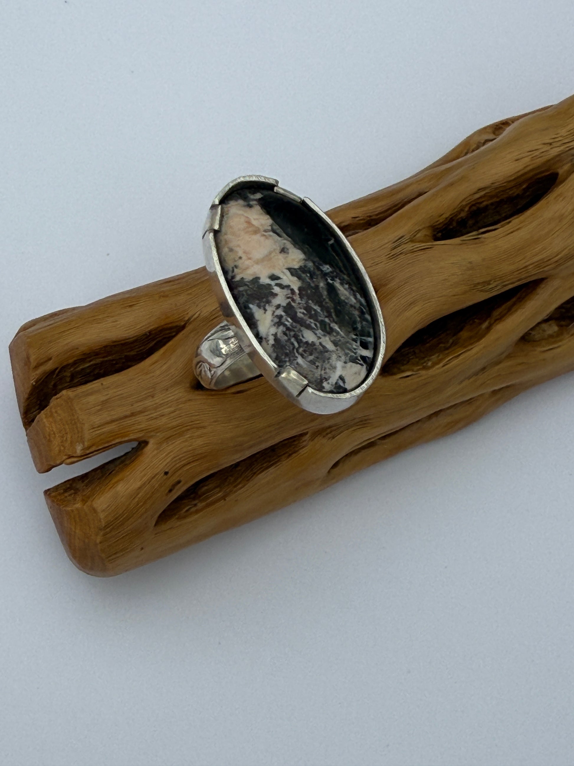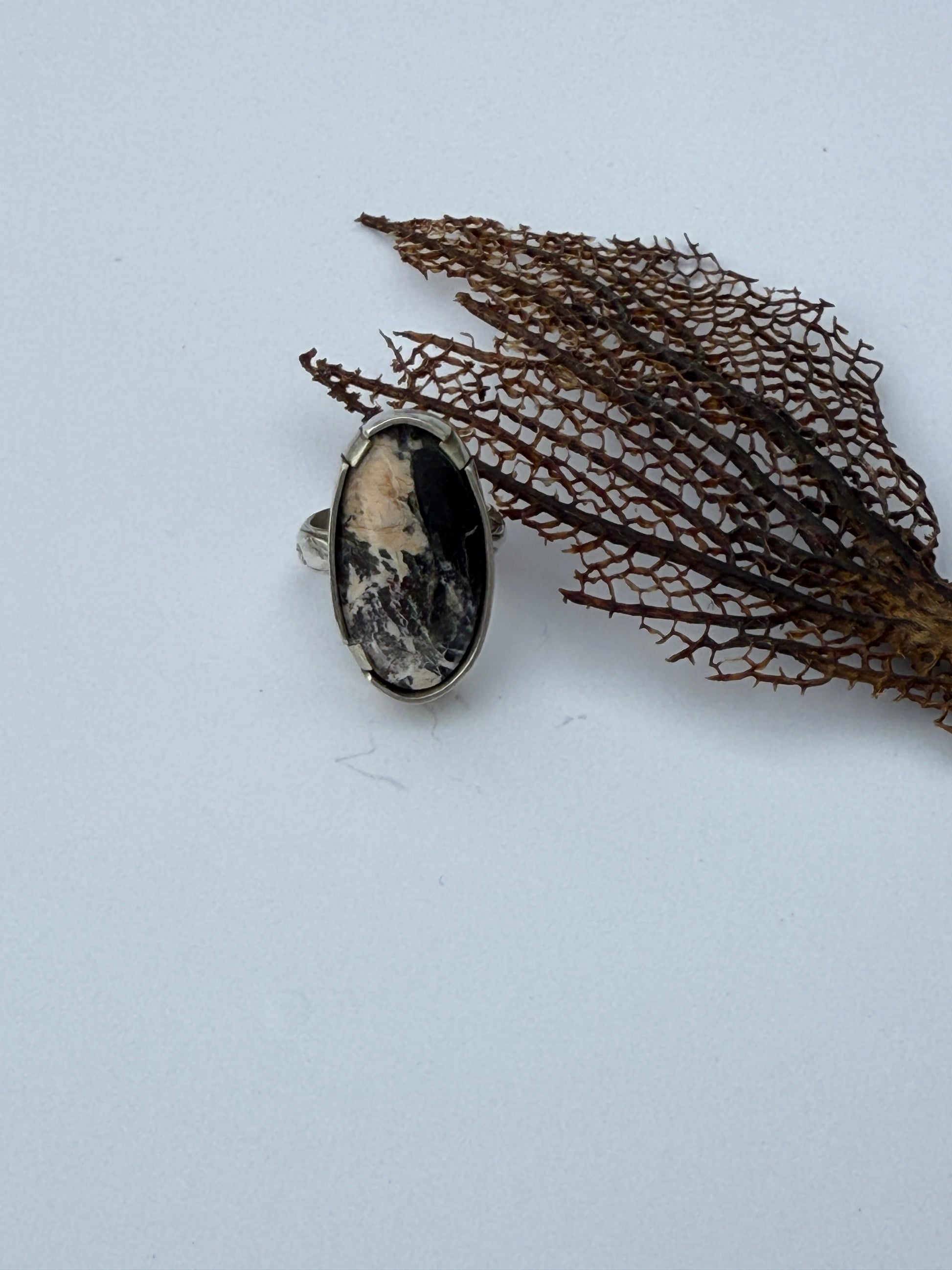 The Snowcapped Reflection Ring embodies the quiet beauty of winter’s stillness — where mountain peaks meet open sky and the world feels hushed beneath a blanket of snow. Featuring a mesmerizing piece of White Buffalo Turquoise, the stone’s marbled white and black patterns mirror the contrast of light and shadow found in nature’s most peaceful moments. Set in handcrafted sterling silver, the band’s subtle texture adds an organic touch, reminiscent of wind-carved stone and frosted earth.