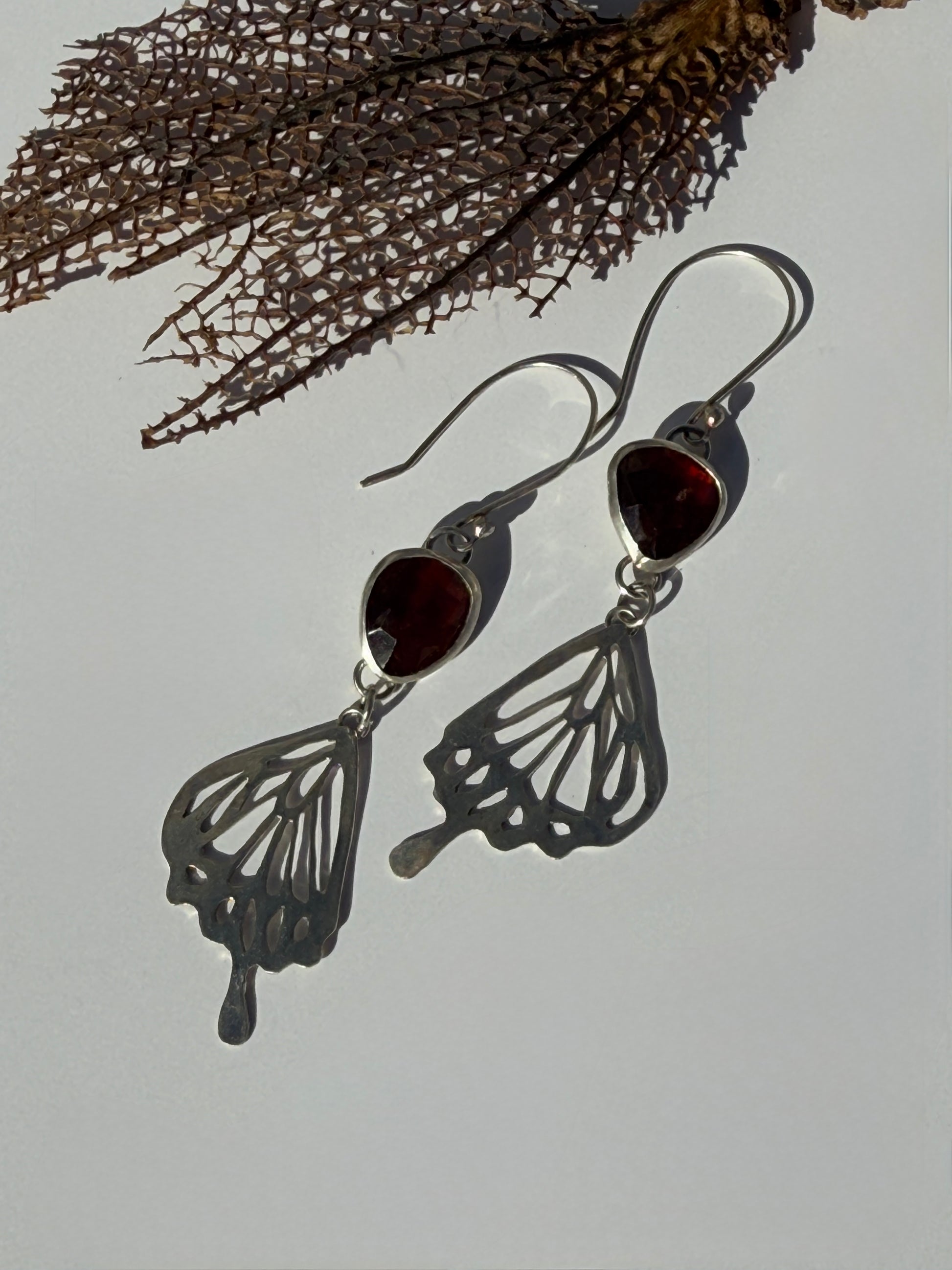 Crimson Wing Earrings: Sterling Silver Butterfly Wings & Hessonite Garnet